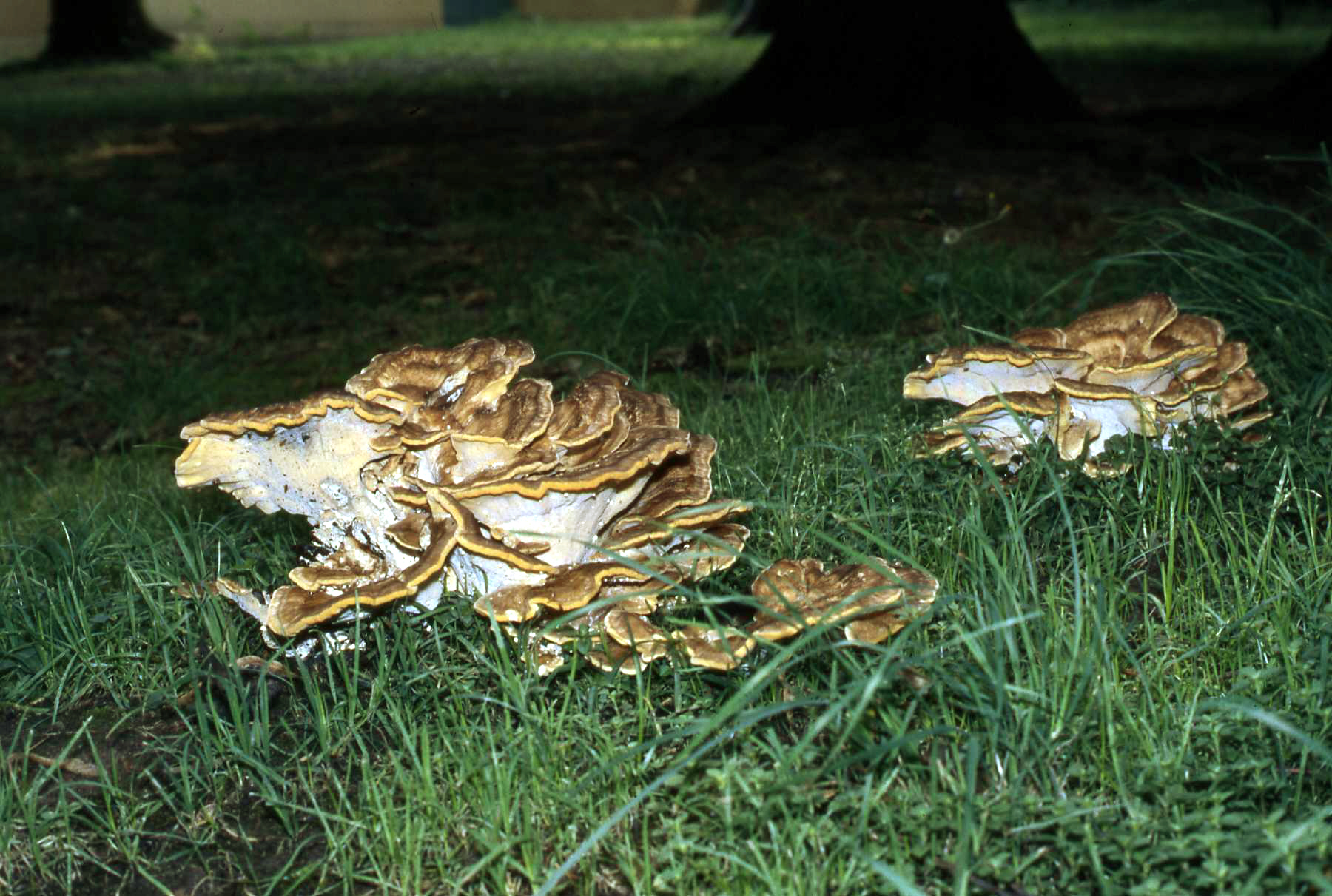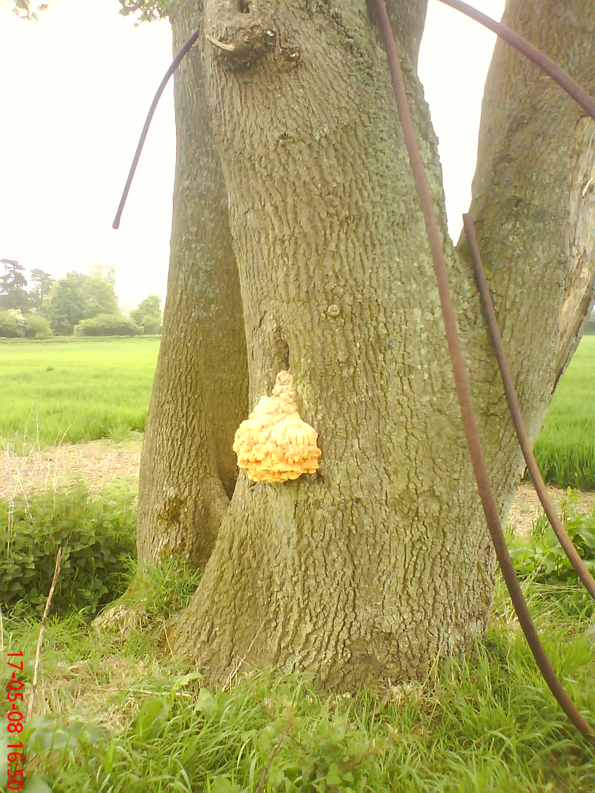 Laetiporus sulphureus. Chicken Of The Woods. This fungus causes a brown cubicle rot in its host. Can also be used as a substitute for chicken in vegetarian meals when fresh. Near Farringdon, Alton.
