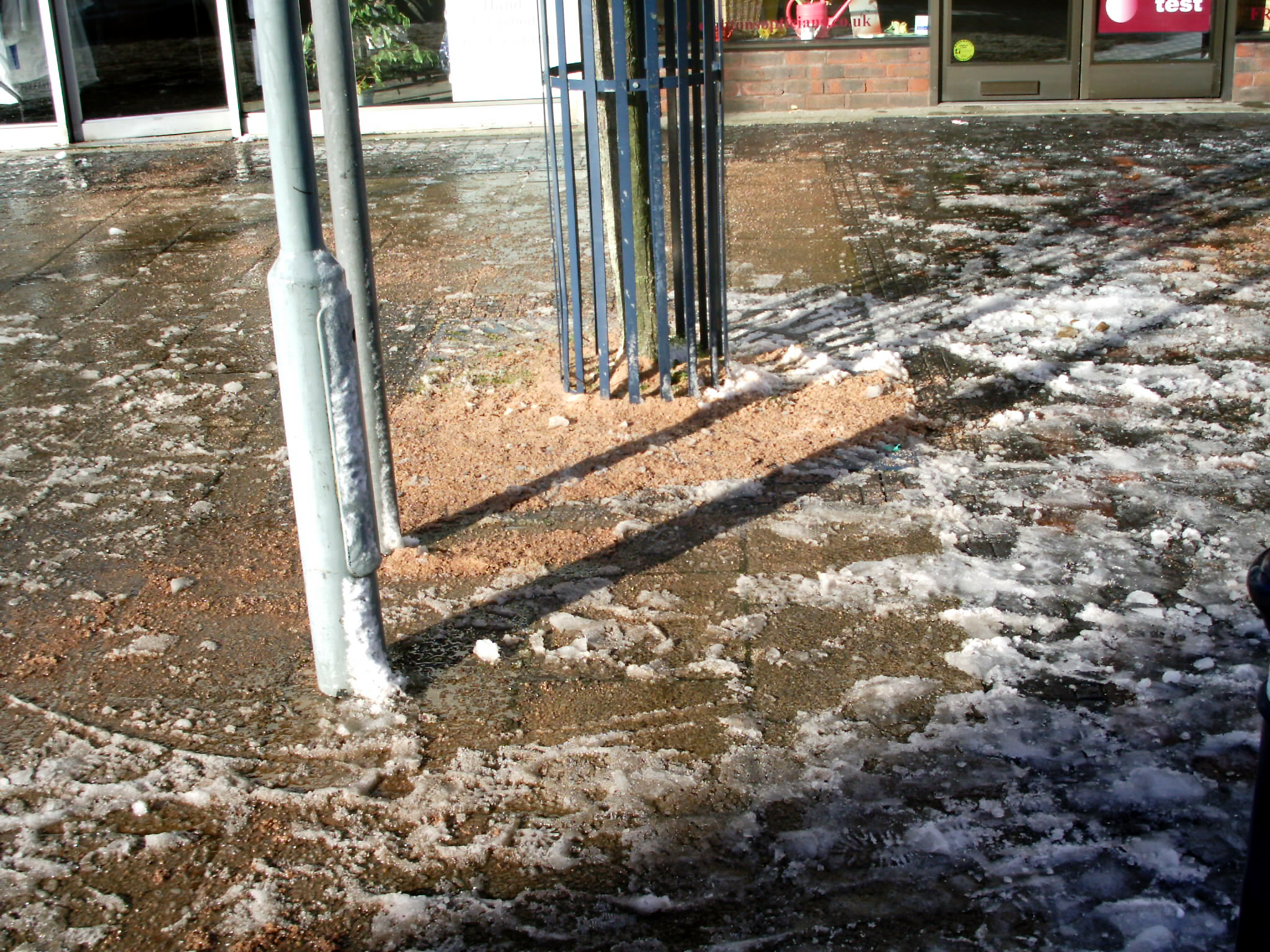 Overdose of road salt - this can kill a tree, and will certainly affect its vigour. Maybe try builders sand for pavement areas instead.